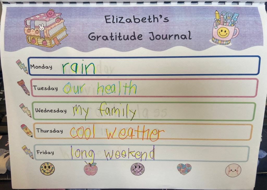A couple of years ago, we started using gratitude journals. Monday though Friday we list one thing we are thankful to Jesus for. We write things like: Good sleep, sunshine, new flowers, the rain, family, vacations. Simple things. This way our daughter is reminded that every good and perfect gift comes from above. This is something we incorporate into our homeschool schedule and use as handwriting activity. I will start with saying, “What are we thankful for today?” and give her a few seconds to think. I verbalize a couple of options and then she will nod when she likes what I say. It’s usually the latter. I will write it in highlighter, and she will trace the words. After writing in our journal, we pray to give thanks and to ask Jesus to be with us as we do our homeschooling.